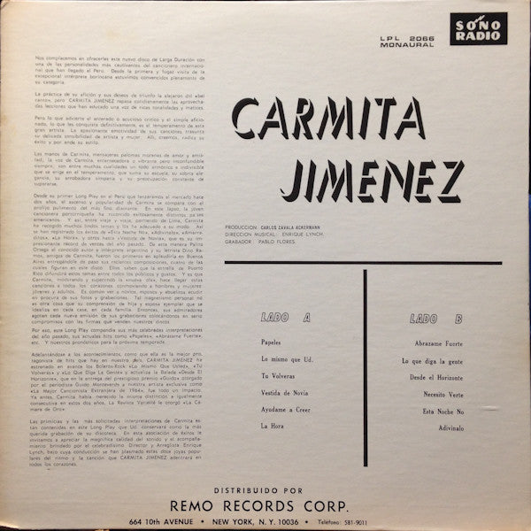 En Papeles, Carmita Jiménez vuelve a cautivar con su poderosa interpretación vocal, esta vez respaldada por los elegantes arreglos de Enrique Lynch y su orquesta. Este álbum presenta una colección de temas románticos y nostálgicos que destacan por su lirismo conmovedor y su instrumentación rica, ofreciendo una experiencia musical inolvidable.
