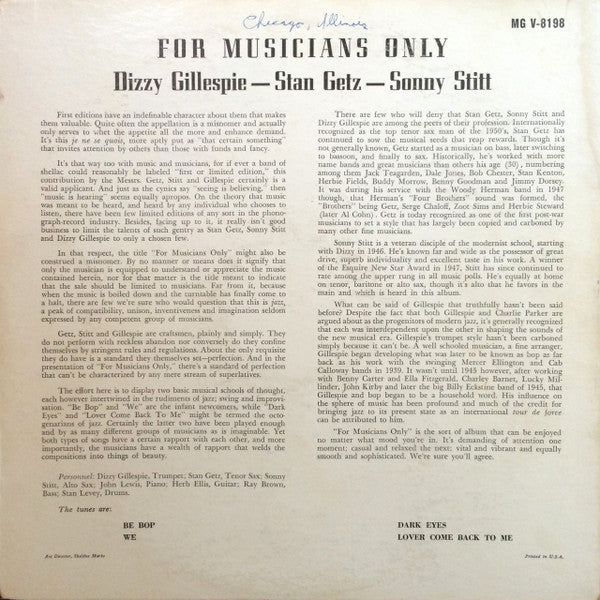Descubre "For Musicians Only," un álbum imprescindible que reúne a tres leyendas del jazz: Stan Getz, Dizzy Gillespie y Sonny Stitt. Este vinilo captura la magia de una sesión de jazz excepcional, con interpretaciones maestras que destacan la habilidad y la creatividad de cada uno de estos íconos. Lanzado en 1961, el álbum es un testimonio del virtuosismo y la innovación en el mundo del jazz.