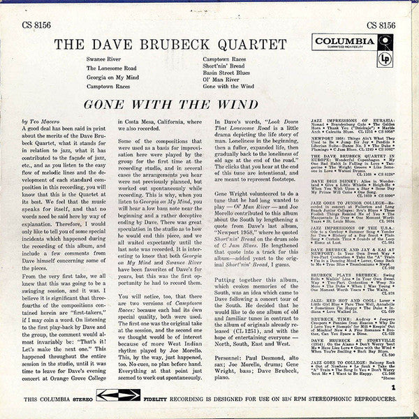 Lanzado en 1959, Gone With The Wind es una joya del jazz clásico interpretada por el icónico Dave Brubeck Quartet. Este álbum rinde homenaje al sur de los Estados Unidos con una colección de estándares y melodías inspiradas en la región. La maestría de Brubeck al piano se complementa a la perfección con el virtuosismo de Paul Desmond en el saxofón alto, Eugene Wright en el bajo y Joe Morello en la batería. Con su mezcla de swing y sofisticación, este LP captura la esencia de la era dorada del jazz. Ideal para coleccionistas y amantes del jazz atemporal.