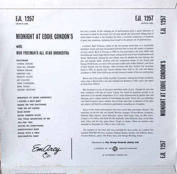 Este álbum en vivo captura la energía y el virtuosismo del jazz clásico de la mano de Bud Freeman y su All Star Orchestra. Grabado en el famoso club Eddie Condon's en Nueva York, la grabación ofrece una mezcla de jazz tradicional y swing, destacando la destreza de Freeman como saxofonista. Las interpretaciones son vibrantes, con una sección de metales enérgica y un ritmo contagiante, ideal para los amantes del jazz de la vieja escuela.