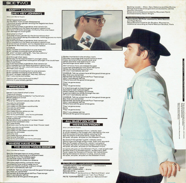 Este vinilo presenta Jump Up!, el álbum de Elton John que incluye el emotivo clásico "Empty Garden (Hey Hey Johnny)", un tributo a John Lennon. Con su mezcla de pop, rock y letras profundas, este disco captura la creatividad de Elton en los 80. Ideal para los fanáticos de Elton John y coleccionistas de vinilos, es una adición esencial para cualquier colección de pop-rock.