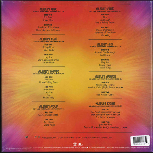 "Winterland" es un álbum en vivo de The Jimi Hendrix Experience, lanzado en 2011, que captura la energía y el virtuosismo de Hendrix durante sus conciertos en el Winterland Ballroom de San Francisco en 1968. Este conjunto de grabaciones ofrece una mirada profunda al auge de su carrera, con interpretaciones memorables de clásicos como "Purple Haze," "Foxey Lady," y "Voodoo Child (Slight Return)." La calidad sonora y la intensidad de la actuación hacen de este disco un tesoro para los fanáticos del legendario guitarrista, mostrando su habilidad para fusionar rock, blues y psicodelia. Un imprescindible para los amantes del rock de los 60.